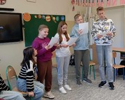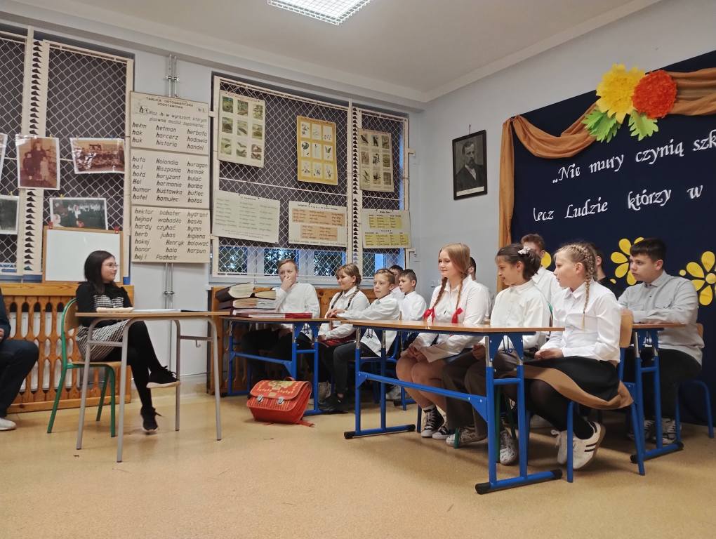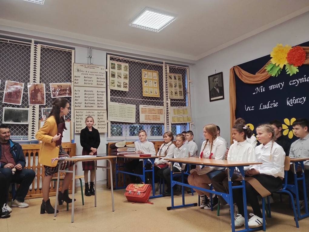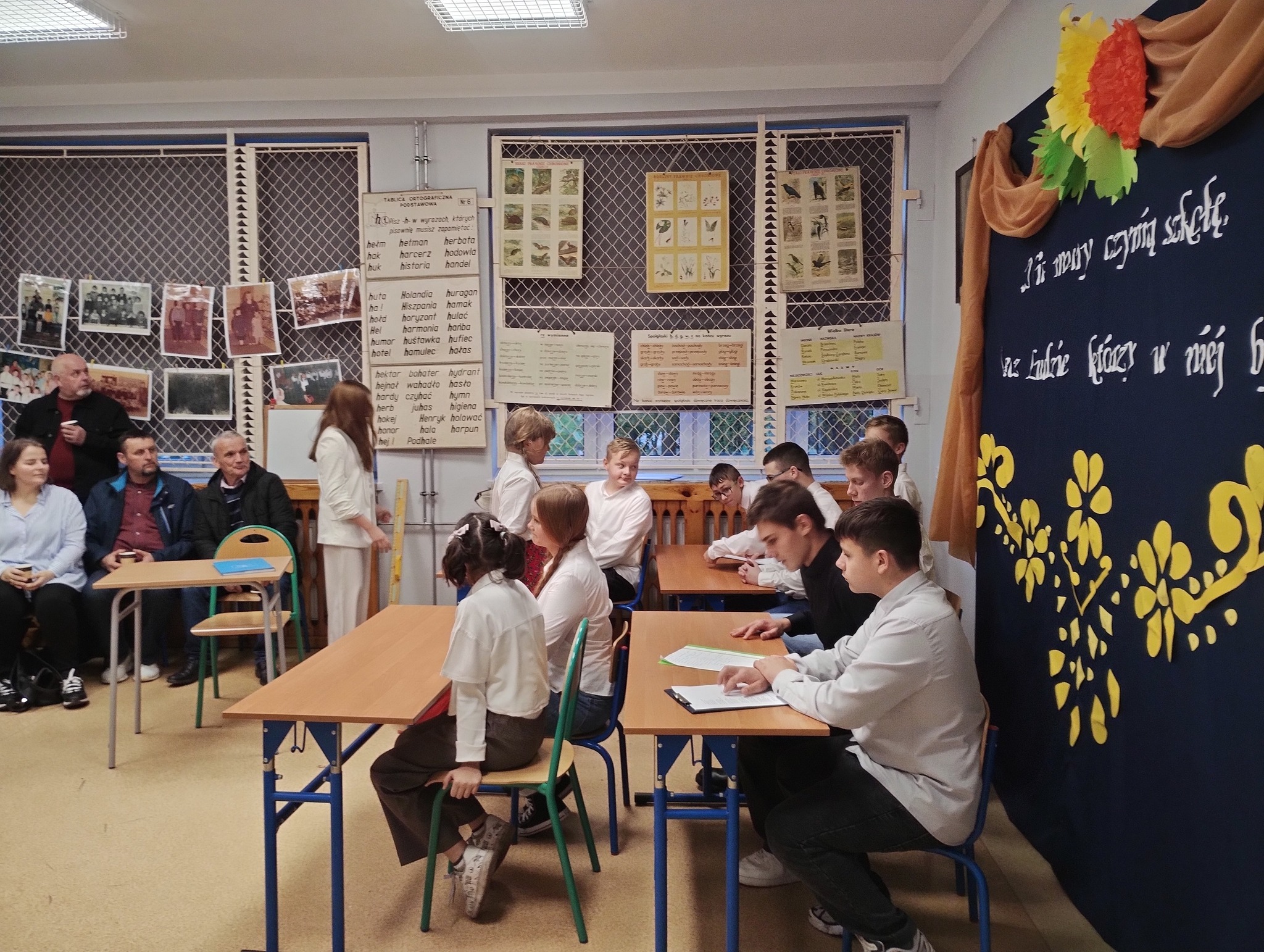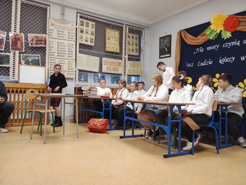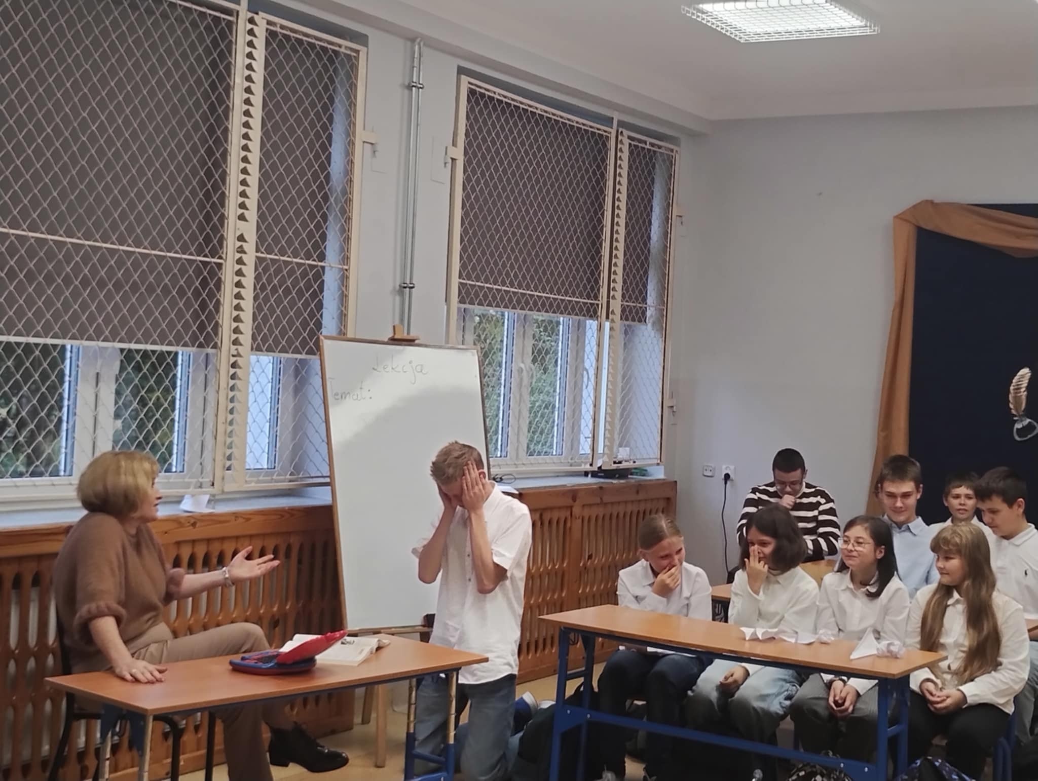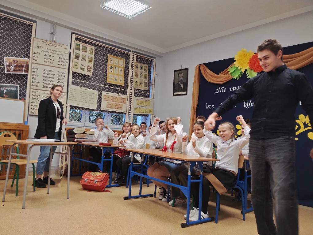 Z okazji Dnia Nauczyciela starsi uczniowie naszej szkoły przygotowali zabawny skecz. Wcielili się w rolę uczniów i nauczyciela. Pracownicy szkoły mieli też możliwość powspominać lata młodości.