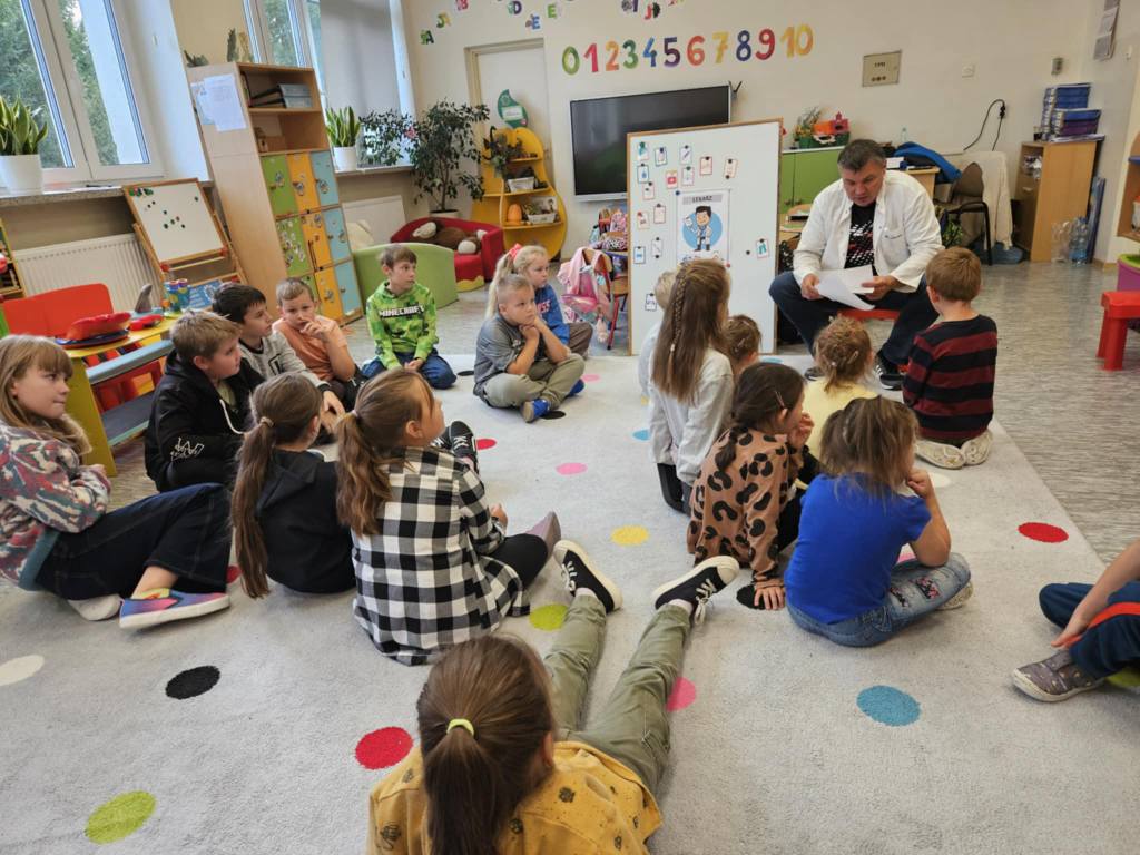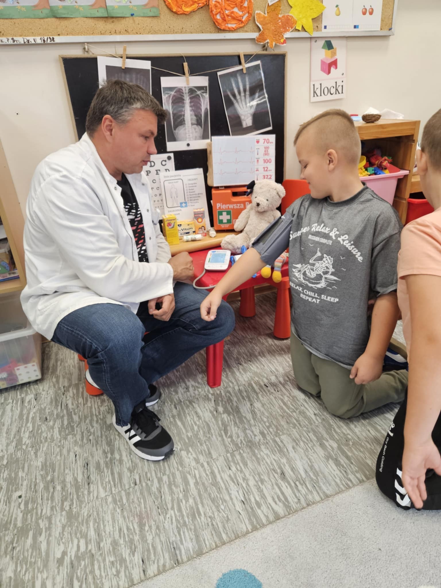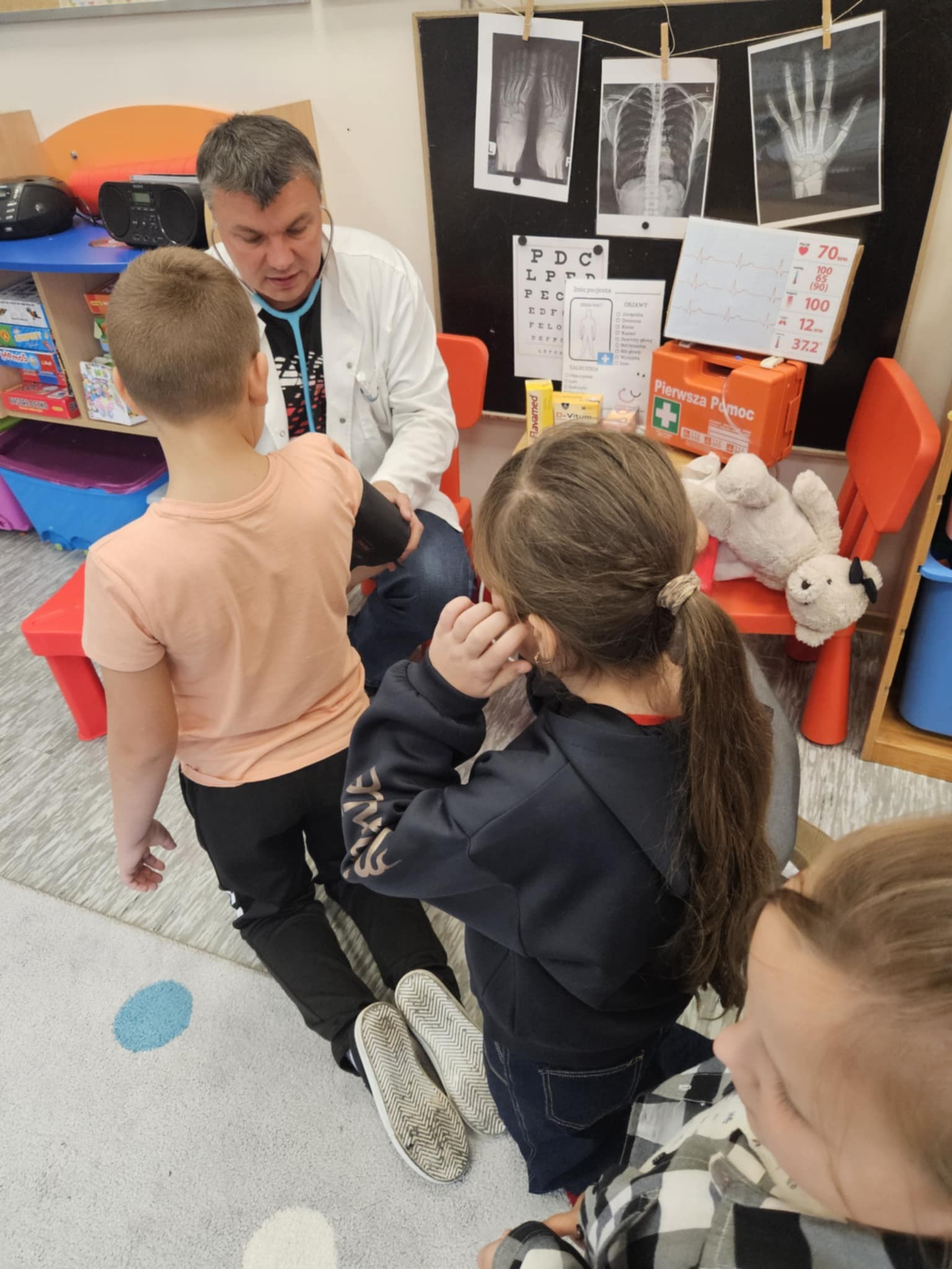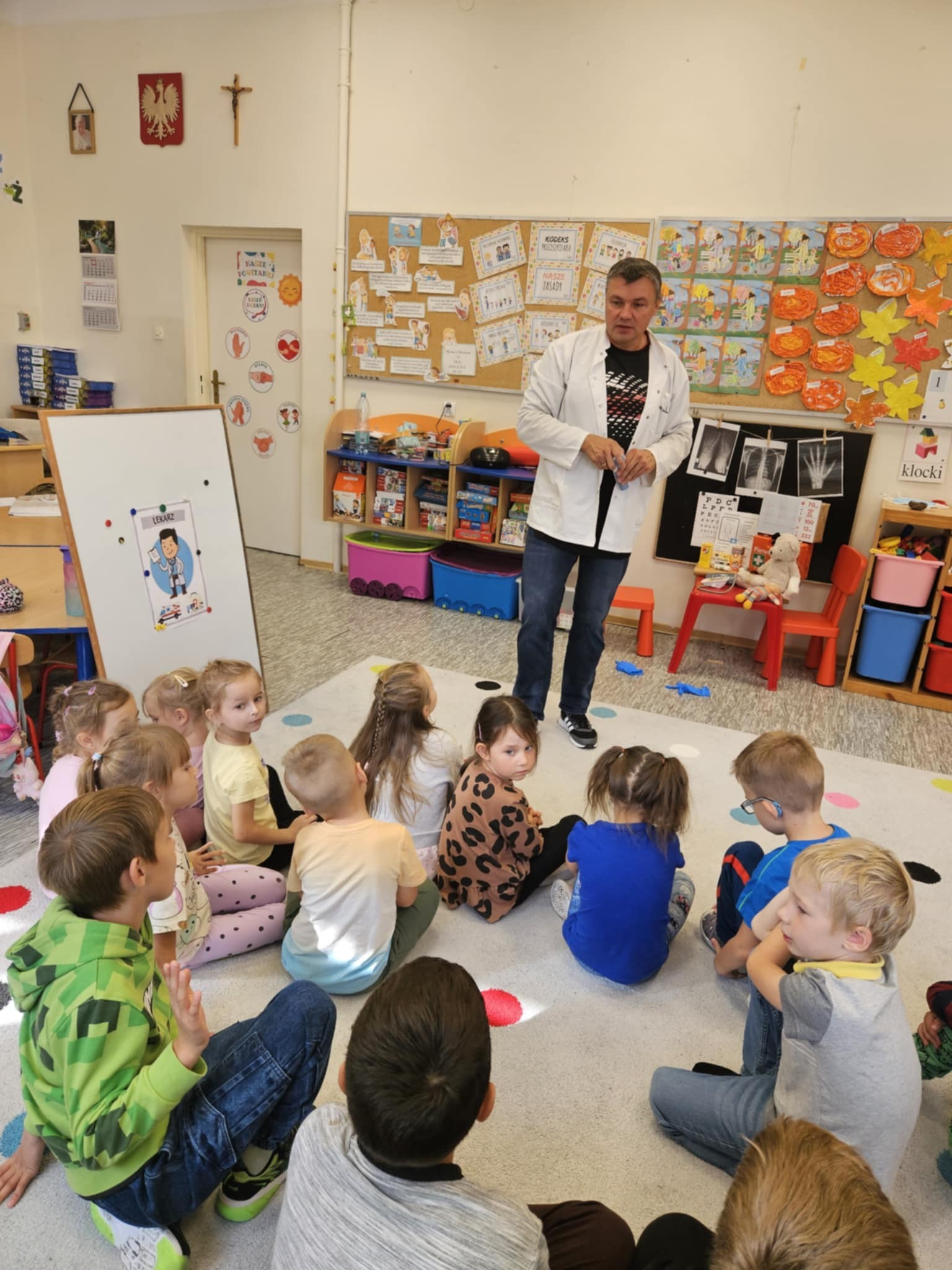 1 października obchodzimy Międzynarodowy Dzień Lekarza W związku z tym wydarzeniem Naszą szkołę odwiedził specjalny gość Dr Rafał Czarnecki. Dzieci dowiedziały sie wielu ciekawych informacji m.in.: jak wygląda praca lekarza, jakich rzeczy używa lekarz w codziennej pracy, jak wygląda badanie w gabinecie lekarskim. Nasz gość przeczytał także dzieciom wiersz o tym jak dbać o zdrowie ,co zapoczątkowało dyskusje na temat codziennych nawyków służących naszemu zdrowiu. Dzieci miały możliwość wykazania sie swoją wiedzą na temat zdrowia rozwiązując ciekawe zadania pod okiem Pana Doktora.Wszyscy uczniowie z uwagą słuchali Naszego Gościa, zadawali dużo pytań, a nawet sami na chwilę mogli wcielić się w rolę lekarza. Dziękujemy serdecznie Panu Doktorowi za poświęcony czas i bardzo ciekawe spotkanie.