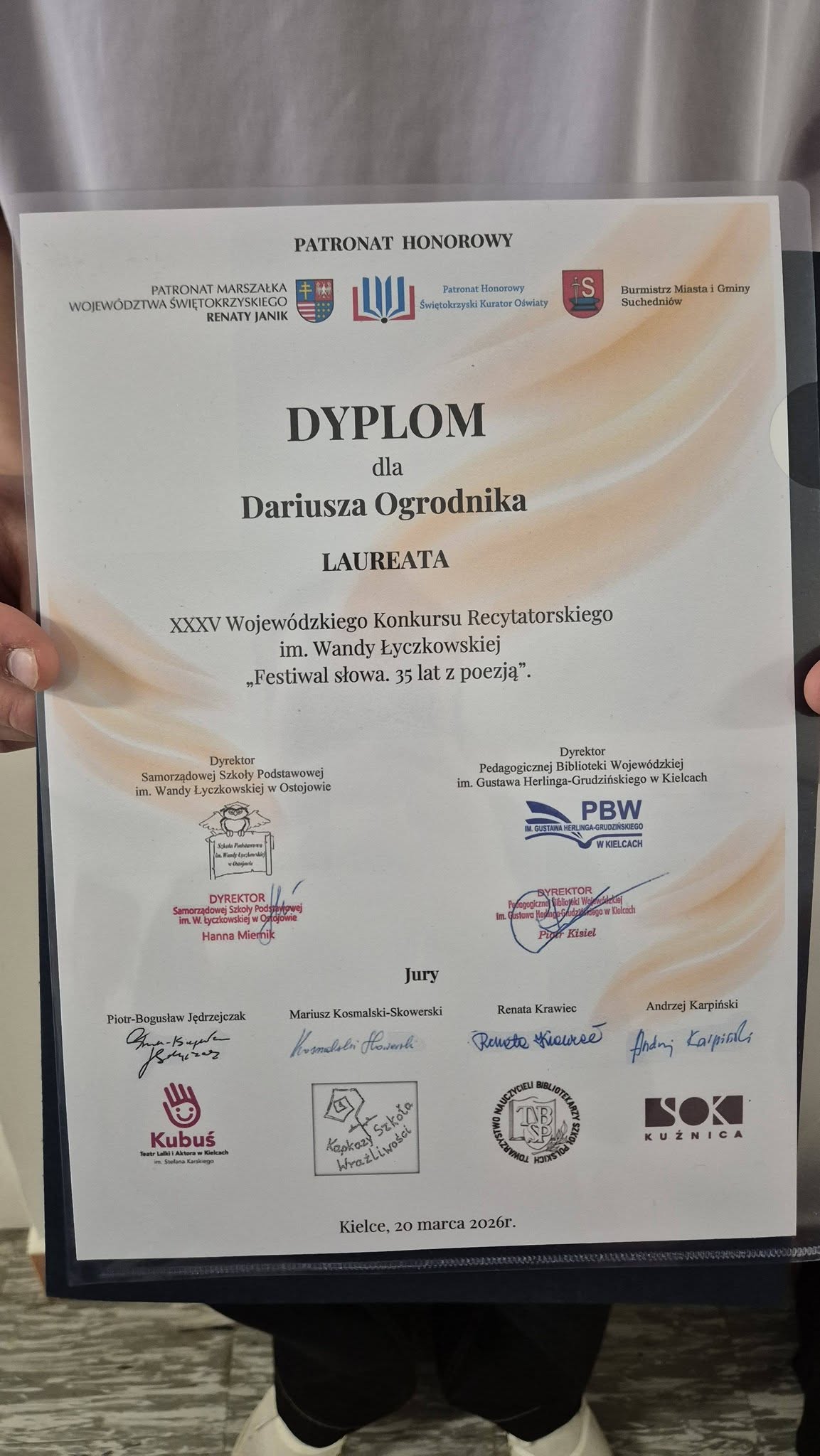 Z ogromną dumą informujemy, że 20 marca nasz uczeń Dariusz Ogrodnik został laureatem XXXV Wojewódzkiego Konkursu Recytatorskiego im. Wandy Łyczkowskiej „Festiwal słowa. 35 lat z poezją”!